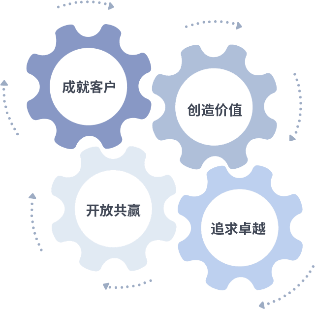 成就客户是一切决策的出发点,,创造价值是衡量所有工作的标准,,追求卓越是我们做事做人的态度,,,,开放共赢是我们的格局也是最终的结果。。价值观的齿轮环环相扣,,,推动着组织里的每个人不断向前。。。